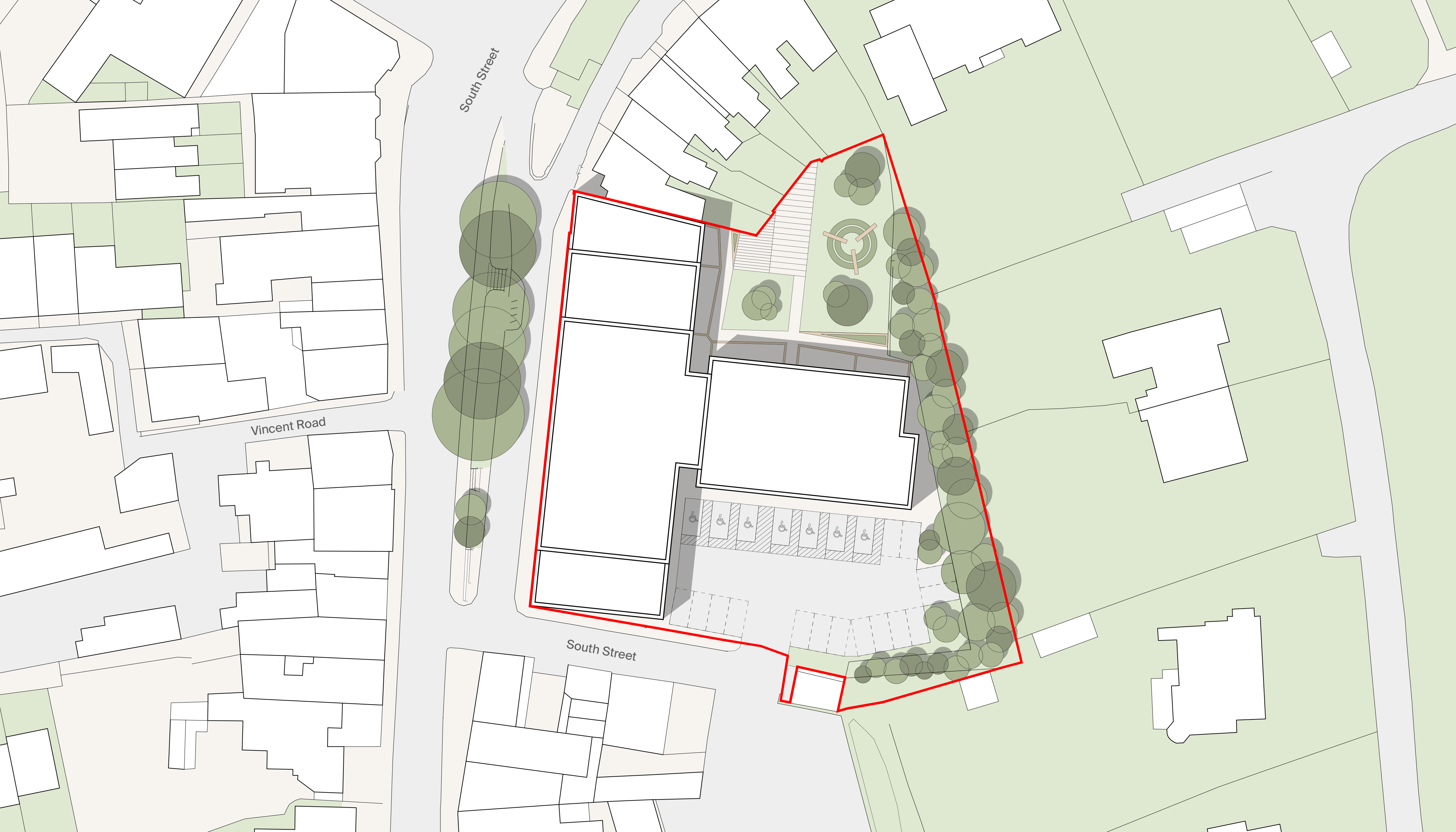 Access to the site will continue to be via the main entrance on South Street, with vehicular access (for residents) via the existing side street which will lead to a car park at the rear of the building.